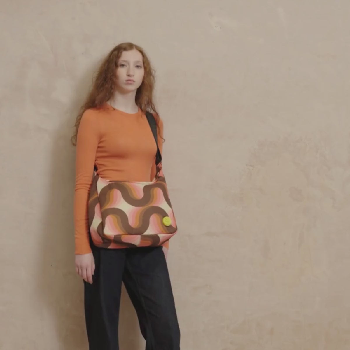 Bold, rhythmic and unapologetically retro, our Rolling Waves print is all about movement and mood. A playful mix of pinks, oranges and browns gives the print a fun, space-age feel - almost other-worldly. With clear nods to the 70s and 80s, it channels a joyful, nostalgic energy while still feeling fresh and wearable. A true statement print, and a firm favourite of Orla herself.