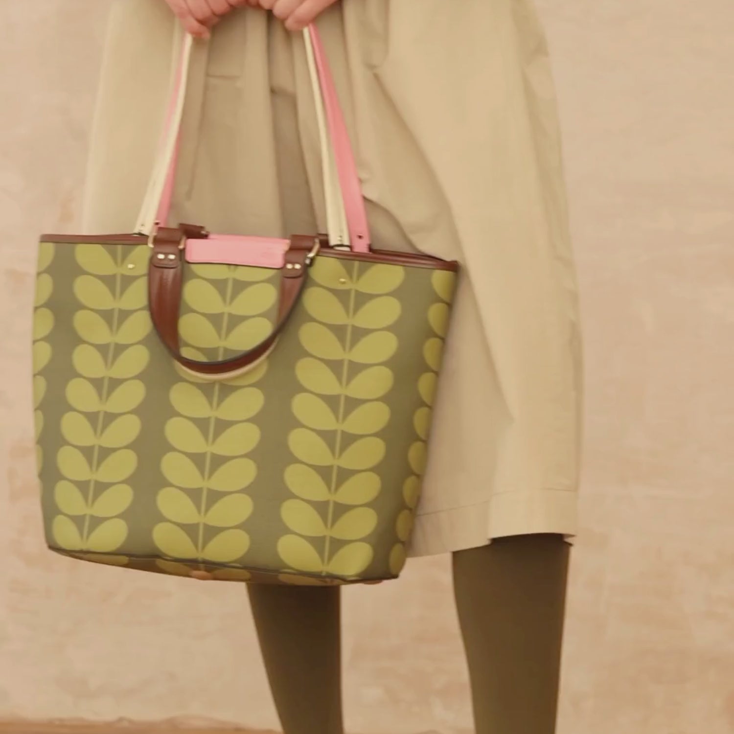 This graphic is one of our most archetypal patterns - the classic solid stem. Most loved for its simplicity and charm, the solid stem has been recoloured in a stunning olive tone for the autumn season. Paired with pale pink accents and brown leather trims.